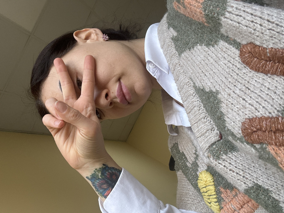 A young adult female is depicted in a close-up, low-angle shot within an indoor setting in Tbilisi, Georgia. She faces the camera, her left hand raised with fingers splayed into a "V" shape, obscuring her eyes and nose. Her mouth is slightly parted, revealing natural pink lips. A small pink, star-shaped stud earring is visible on her right earlobe. She wears a white collared shirt beneath a textured knitted vest with a light beige base, featuring raised patterns in olive green, yellow, and terracotta. A multi-colored butterfly tattoo, predominantly blue, red, and green, is visible on the inner side of her left wrist, above the shirt cuff. The background consists of plain, light-colored walls, likely beige or pale yellow, with a lighter ceiling area, indicating an uncluttered interior space.