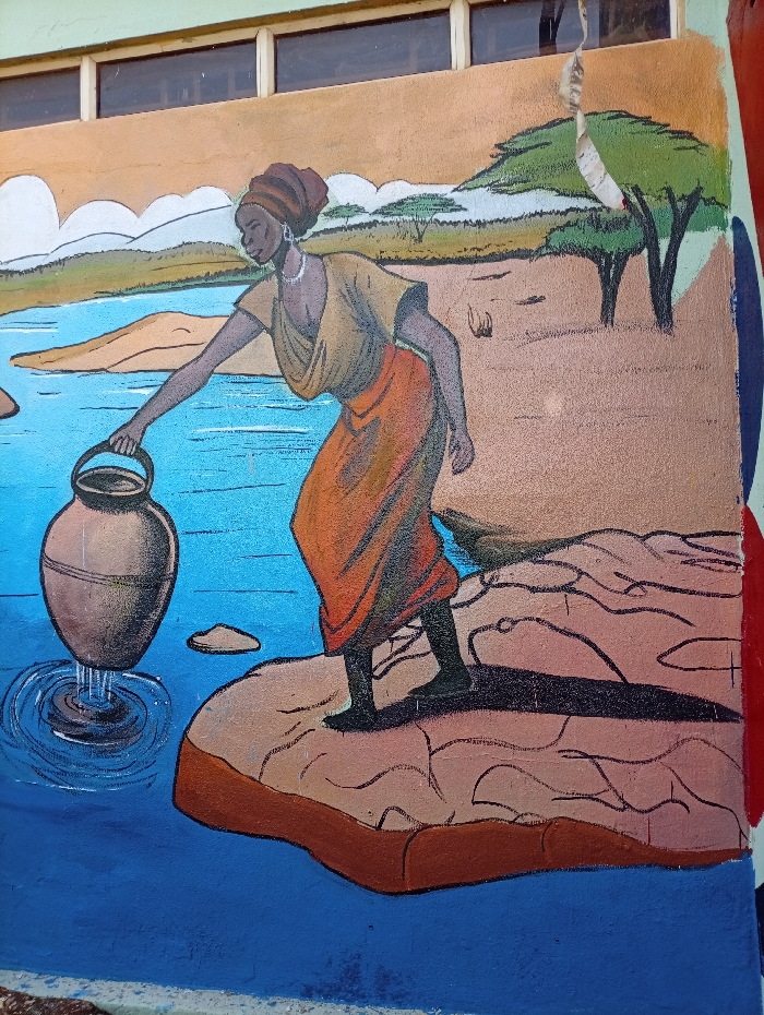 A mural on a wall in Unguwar Shanu, Nigeria, depicts a woman drawing water