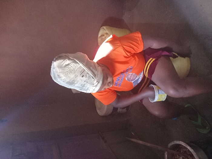 A woman wearing a head covering and an orange shirt with a political figure kneels in a dimly lit room. She's holding a small, white container. Behind her are stacked yellow bags. A bucket filled with material sits in the lower right corner, with a mixing stick beside it. Her lower legs are visible, showing maroon shorts with yellow stripes and green flip-flops on one foot. The room's walls appear to be a dark color.