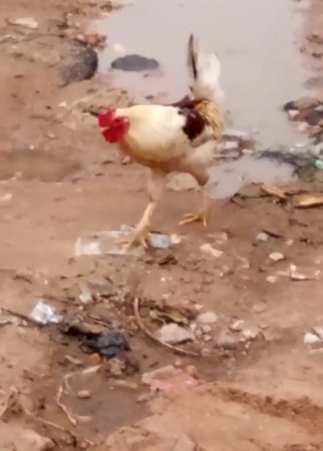 A white rooster with brown and red markings is walking on muddy ground littered with trash. Another smaller, darker chicken is visible in the background. There is a puddle of water nearby.