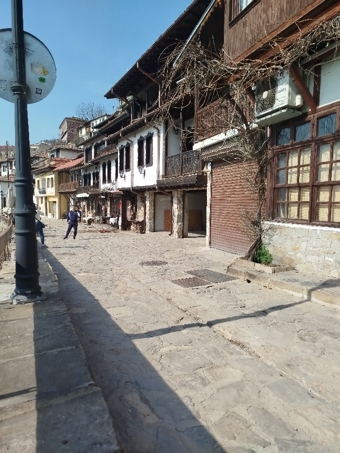 This image captures a daytime scene on a cobblestone street in Veliko Tarnovo, Bulgaria, facing generally northeast