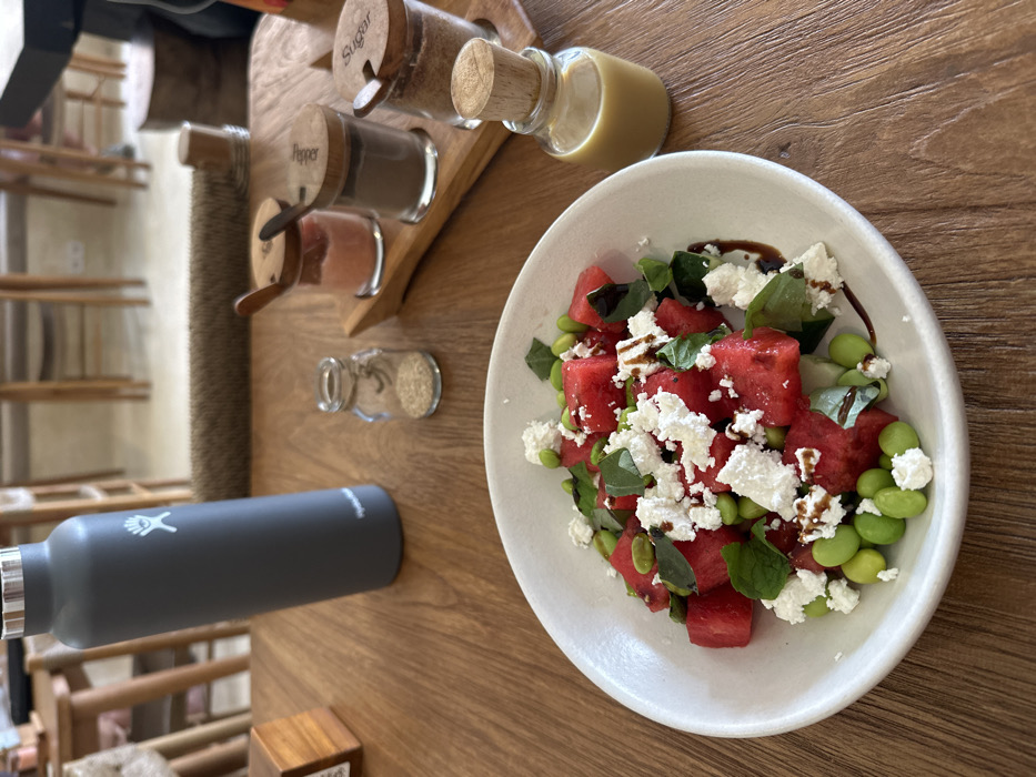 A high-angle shot shows a white bowl filled with a salad of cubed watermelon, feta cheese, edamame, and basil, drizzled with balsamic glaze, on a wooden table. Adjacent to the bowl are jars labeled "Sugar" and "Pepper," along with other spice containers on a wooden holder, and a small bottle of liquid. A gray Hydro Flask water bottle lies next to them. The scene is bathed in natural light.