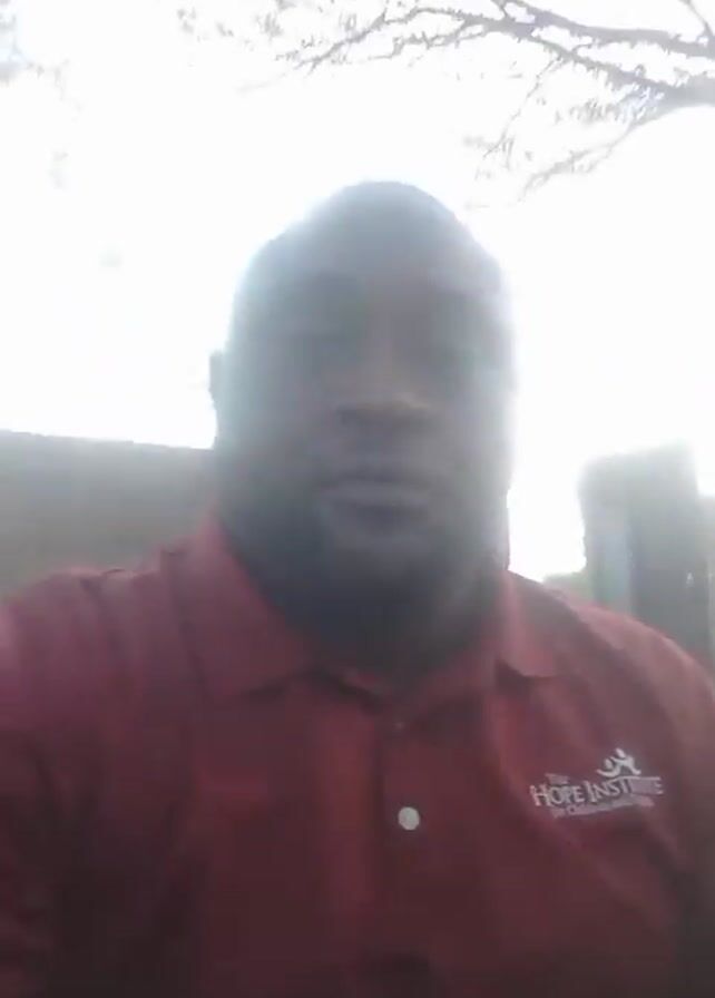 person with dark skin wearing a red polo shirt with "The Hope Institute of Canada" embroidered on it. They are speaking in the video. The background is blurry, but it appears to be an outdoor setting with trees and possibly a brick structure. The video's lighting fluctuates between bright and dark, possibly due to changing natural light conditions.