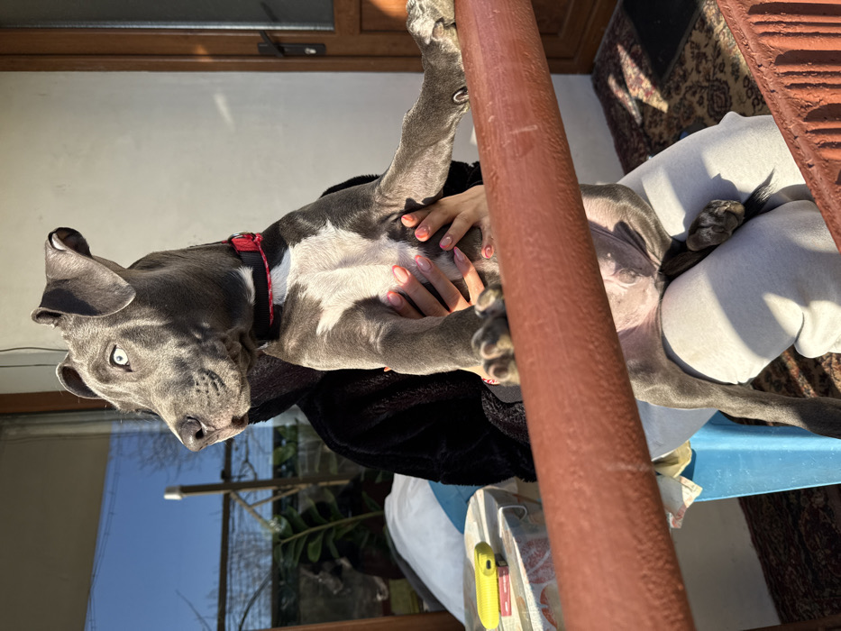 - "A gray-blue puppy, possibly a Pitbull or American Bully type, with light blue eyes and a red and white collar, is held upright by a partially visible individual in Zornitsa, Bulgaria" by FM-NMkt72, licensed under CC BY 4.0