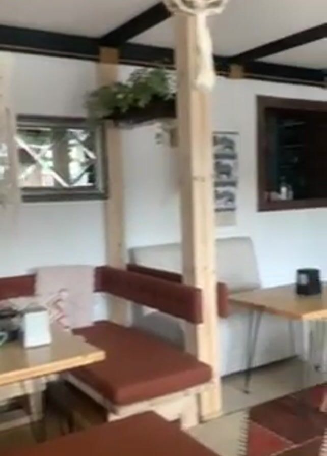 interior of a well-lit room. The room has a white ceiling with dark wooden beams. There is a dining area with a wooden table surrounded by built-in bench seating with red-brown cushions. Decorative macrame lampshades hang from the ceiling. A small fireplace is visible in the background with a cat laying on a bench next to it. Other areas include a bar area and small decorative plants. The room is decorated with a mix of rustic and modern elements. The camera pans across the space, showcasing the different areas of the room.