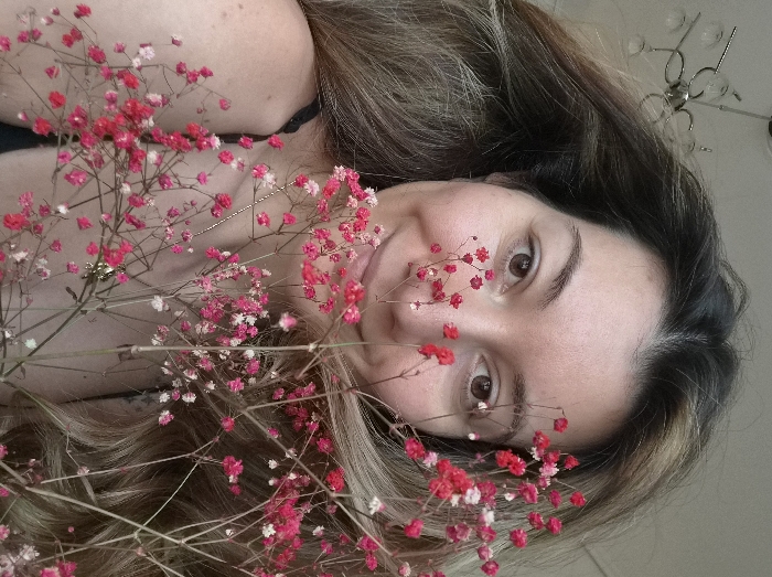 A female subject, appearing to be an adult, is depicted in a close-up, frontal portrait, located in the Municipal Unit of Corinth, Greece. She has long, wavy, multi-toned brown hair with lighter highlights and brown eyes, looking directly at the camera with a slight smile. A dark-colored strap from a garment is visible over her left shoulder, and a thin necklace with a small, circular, metallic pendant is worn on her chest. A cluster of thin-stemmed, dried or preserved flowers, primarily bright pink and red Gypsophila with some white blossoms, is positioned in the foreground, partially obscuring the right side of her face and upper torso. The background is a light-colored, indistinct surface, with a metallic chandelier featuring multiple glass shades visible in the upper left portion.