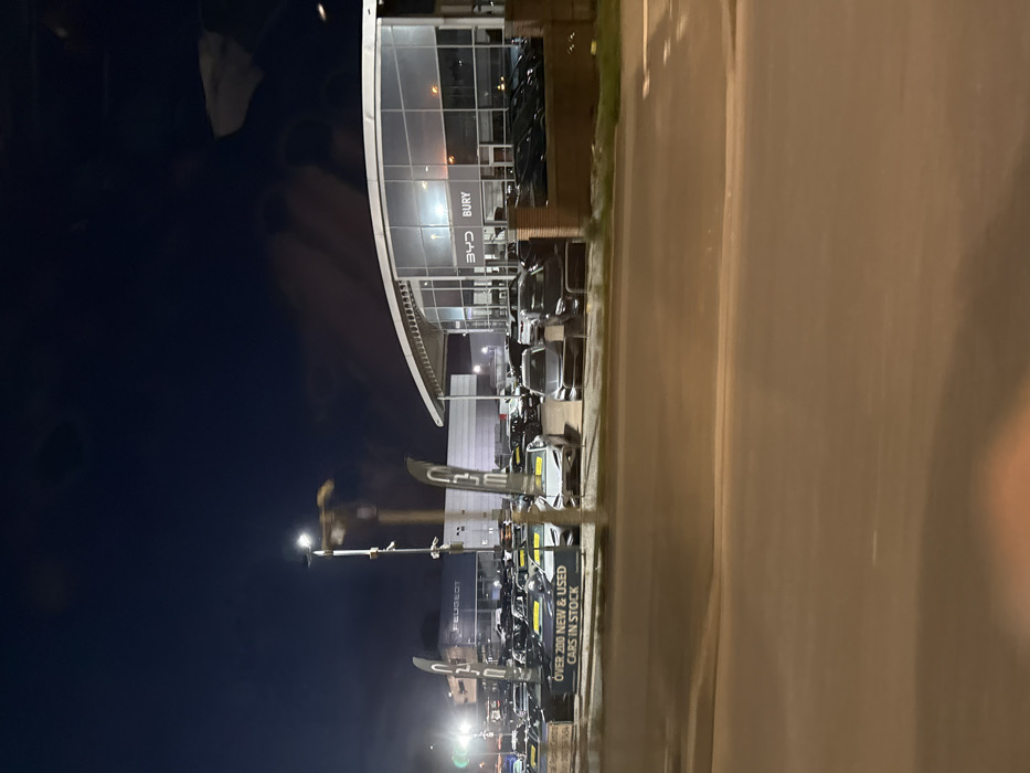 This nighttime image captures a commercial automotive sales area in Bury, United Kingdom