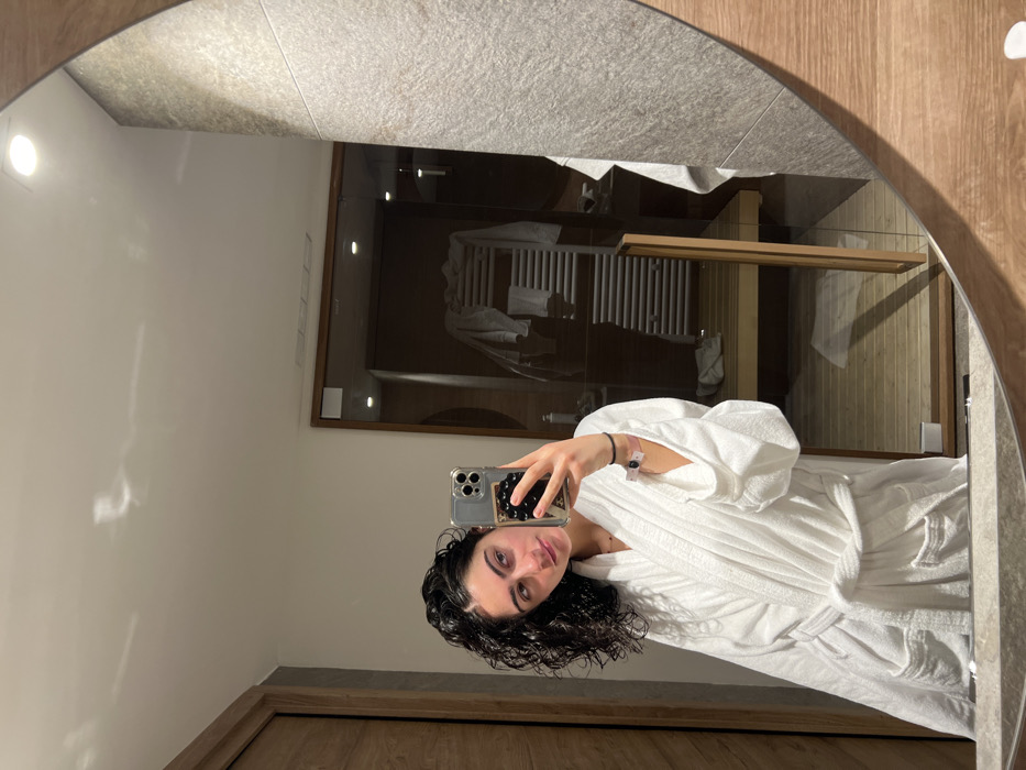 A woman in a white robe takes a selfie in a mirror. She holds her phone up with her left hand. Her dark curly hair is wet. The mirror is round with a wooden frame. The bathroom is modern, with light gray walls and wood accents. A glass-enclosed sauna is visible in the mirror's reflection, containing a wooden bench, and a towel rack with towels.