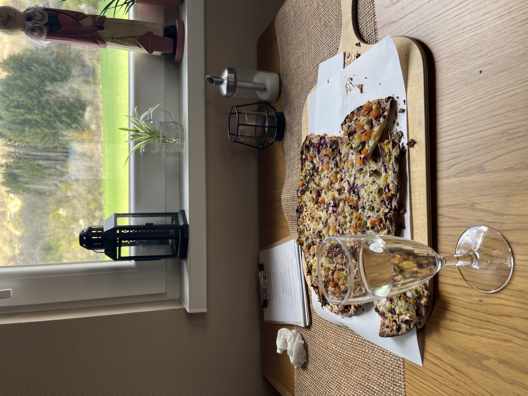 The photograph depicts a table setting indoors. On a wooden table covered with a woven mat, there is a wooden cutting board with what appears to be a flatbread or pizza topped with a variety of vegetables. Next to it lies a champagne glass nearly full of liquid. To the left of the cutting board, there's a clipboard with papers on it and a crumpled napkin. The scene is near a window ledge, on which there are several decorative items: a carved wooden figure, a small plant in a glass container, a sugar dispenser, and a black lantern. Outside the window, greenery is visible. A document appears to have the word "Raumbach" written on it, so it can be inferred the picture was taken in or near Raumbach, Germany.