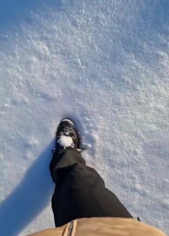first-person perspective of someone walking in the snow. The person is wearing black pants, a tan puffer jacket, and black shoes. The snow appears to be fresh and untouched, and the sky is a clear blue. The person is walking at a steady pace, and the only sound is the crunching of their shoes in the snow.