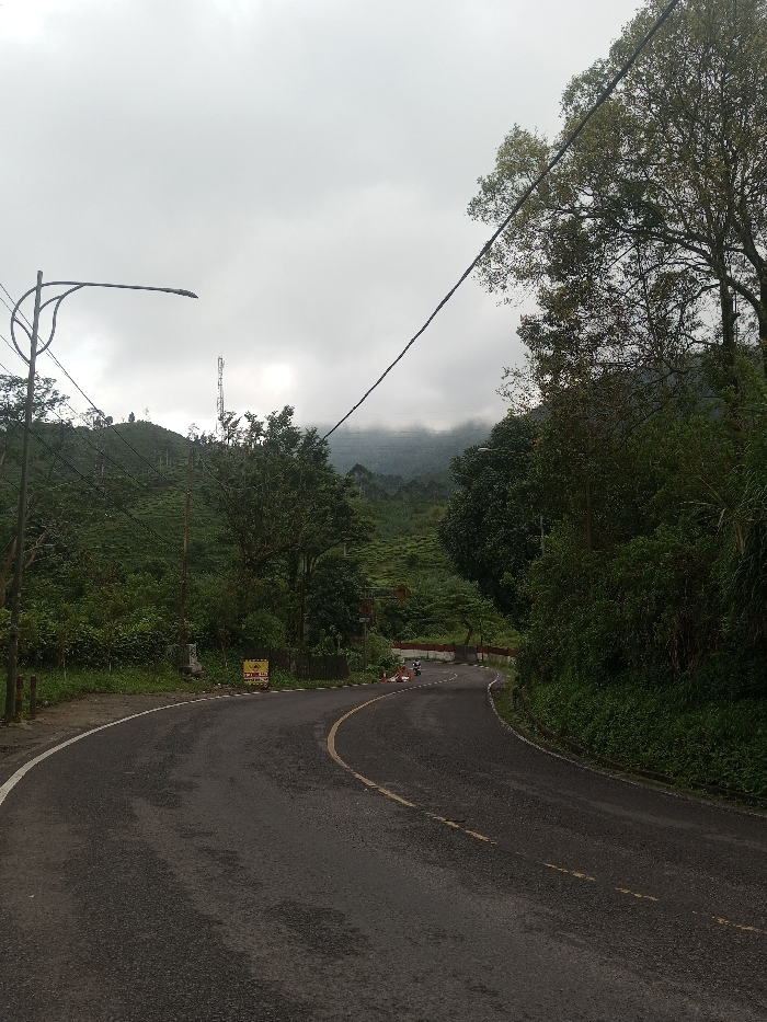 This image depicts a mountainous, verdant landscape observed from an asphalt road, set in the city of Thanthirimale, Sri Lanka. The sky is uniformly overcast, casting a soft, diffused light across the scene. In the foreground, an asphalt road curves sharply to the right, showing a white solid line along its left edge and a faded, intermittent yellow line in its center. The road surface appears damp. To the left of the road, a dark-colored streetlamp with a curved arm and an LED-style fixture stands prominently. Overhead, multiple black electrical or communication lines traverse the frame. The left side of the road ascends into a hillside densely covered with lush green vegetation, primarily tea plantations visible in terraced rows, interspersed with taller trees. A tall, lattice-structured communication tower is visible on a distant hill, partially obscured by the cloudy conditions. Near the road's edge on the left, a yellow sign with red lettering is partially visible, positioned near what appears to be concrete markers or posts. To the right of the road, dense foliage, including tall trees and thick undergrowth, borders the curve. A thick black cable stretches diagonally across the upper-mid section of the image, running from the upper left toward the right, passing over the road. Further along the curving road, a red and white striped barrier or railing is visible. A single small vehicle, resembling a scooter or motorcycle, is observed in the distance on the curving road, moving away from the viewer. The background features misty mountains heavily cloaked in green vegetation, their peaks obscured by low-hanging clouds. No individuals are clearly discernible.