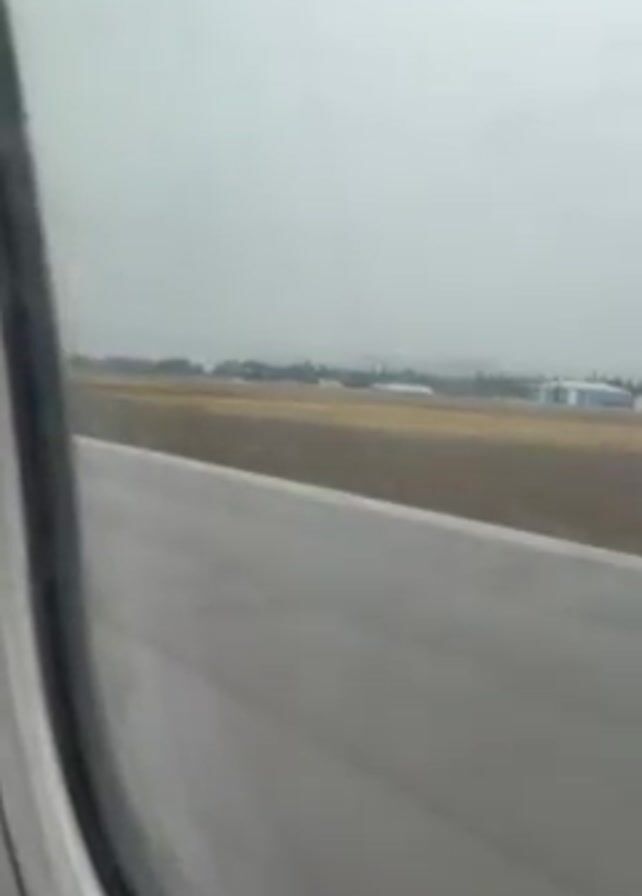 view from an airplane window on a rainy day. The camera is focused on the runway outside the window, which is gray with white lines. In the distance, there is a field of brown grass with some buildings and trees visible. The sky is overcast and gray. The window frame is partially visible on the left side of the shot. The plane is moving.