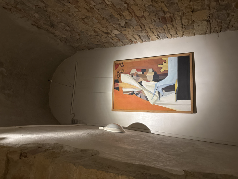 An art gallery in a stone-arched room displays a painting with an orange background. The painting includes an abstract image of a woman in a white dress and a large blue hand. Below the painting is a low, flat, white, dome-shaped light fixture. The bottom of the room is made of stone bricks, while the wall behind the painting is smooth and white.