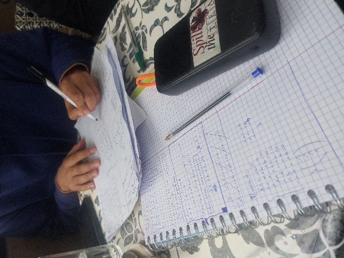 The image captures an indoor scene in Rabat, Morocco, focused on a table surface. A person, identified by their light-brown hands and forearms clad in a blue long-sleeved top, is engaged in writing. Their right hand holds a white marker or pen over a stack of white papers covered with handwritten text and diagrams. The left hand rests on this stack. Below these papers, an open spiral-bound notebook with blue grid lines displays extensive handwritten notes and equations in blue ink, including "Timard" and numerical lists such as "11=140." A blue ballpoint pen lies horizontally on this notebook. To the left, a clear glass containing a transparent liquid is present. To the right, a dark, rectangular electronic device, possibly a mobile phone or speaker, with an orange fabric loop and a sticker labeled "Spill the T_A" is positioned. A green pen is partially visible near the top right of the paper stack. The table is covered with a white and dark patterned tablecloth featuring repetitive abstract or floral designs.