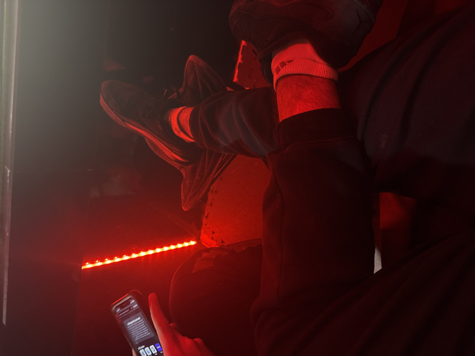 A person is seated with their legs propped up. They wear dark sneakers and white socks. A dark sweatshirt covers their torso and arms. The scene is lit with a red glow, presumably from LED strip lights running horizontally. A smartphone is held in the lower left corner, with a webpage displayed on the screen. The subject's finger rests on the screen. The overall ambiance is dim and red.