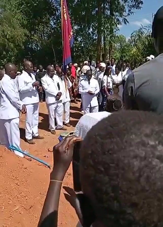 The video depicts a funeral service taking place outdoors. A crowd of people is gathered around an open grave, where a blue coffin is visible, covered with a white cloth. Many attendees, primarily men, are dressed in white suits. A flag with red and blue colors is prominently displayed on a pole. Some people are observing the proceedings, while others are recording the event with their mobile phones. The setting appears to be a rural area with trees visible in the background. The atmosphere is somber and respectful.