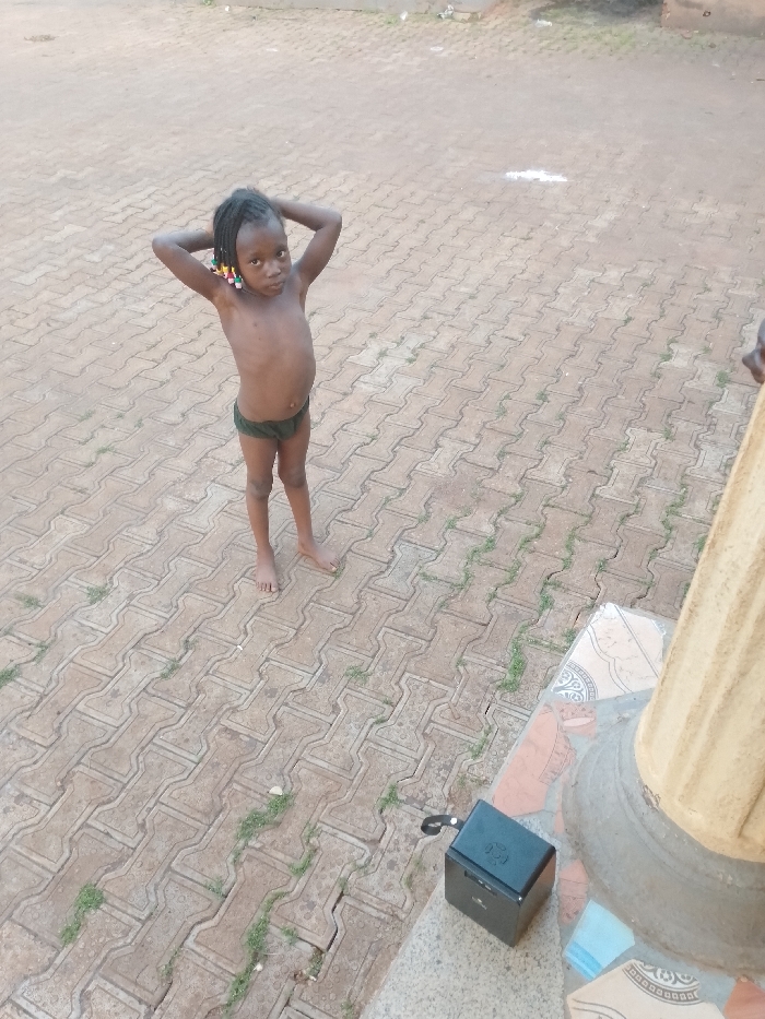 A young, barefoot child stands on a brick-paved surface with hands behind their head. They wear dark-colored briefs and have beads braided into their hair. A small, black, square object sits on the ground near the base of a round, light-colored column. The brick paving shows signs of wear and some sparse greenery. The overall scene is bathed in warm, natural light.