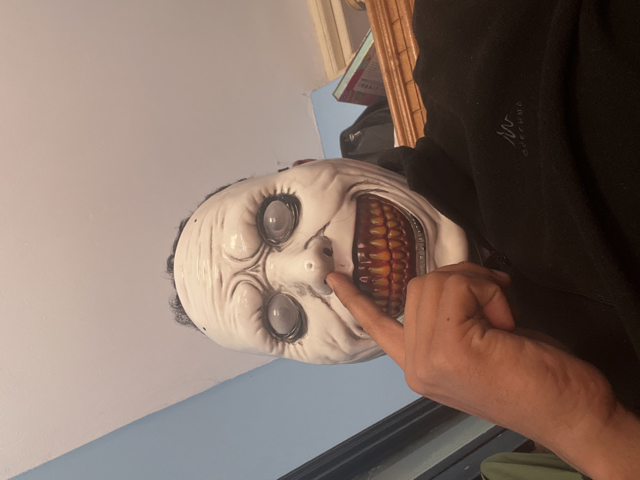 The scene is set indoors in Ouaouizert, Morocco; specific identifying landmarks within the city are not discernible from the image. The central subject is a person wearing a pale white, full-face mask featuring exaggerated wrinkles on the forehead and around the sunken eye sockets, which contain milky-white or clear lenses. The mask displays a wide, fixed grin revealing numerous yellowish-orange teeth with pointed tips, some appearing to have reddish discoloration. Dark, curly hair is visible protruding from the top and sides of the mask. The person's right hand, with medium-dark skin, is raised, and the index finger is inserted into the mask's right nostril opening. The subject is dressed in a dark, likely black, fleece jacket with a "QUECHUA" logo visible on the right chest area. The background consists of a two-toned wall, with an upper section of light off-white or pale pink and a lower section of light blue, divided by a horizontal line. To the left, a dark vertical structure is partially visible, along with a glimpse of green fabric. To the right, behind the subject, a wooden surface with a decorative edge supports partially obscured objects, including a light-colored item with a red detail and a dark piece of fabric.