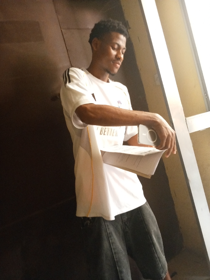 A young adult male, of dark complexion with short dark curly hair and light facial hair, stands indoors in the city of Ihiagwa, Nigeria. He wears a white short-sleeved t-shirt with black stripes on the shoulders and dark grey shorts. His head is tilted downwards, and his gaze is directed towards his hands. His right hand holds a white mobile phone, characterized by a prominent circular camera module, which rests upon a stack of white papers held in his left hand. The background features a dark wall on the left and a lighter-colored wall with a prominent white or silver window/door frame on the right, indicating a bright light source from the right.