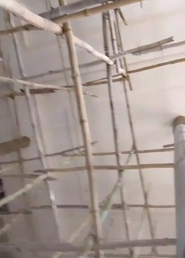 A man is looking upward toward scaffolding made of bamboo poles in what appears to be a construction site. There is a white pipe that is protruding from the ceiling. The man's face is visible at times in the center of the frame.