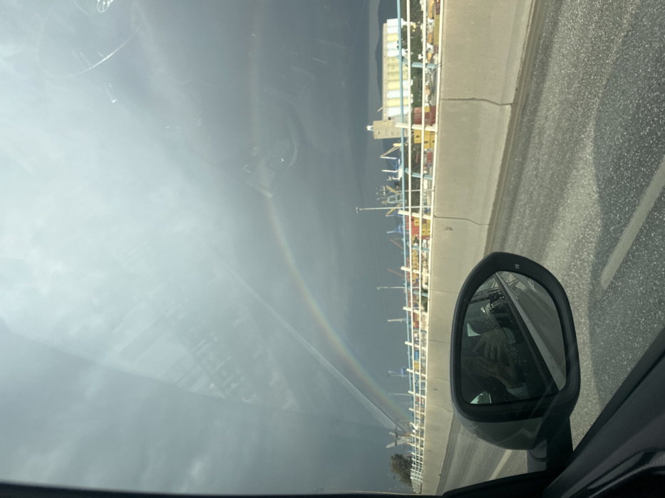 A rainbow is seen through the car's windshield. The reflection includes containers and cranes near the road. The car's side mirror is visible on the right, reflecting the driver. The sky appears overcast. The road is visible on the right side.