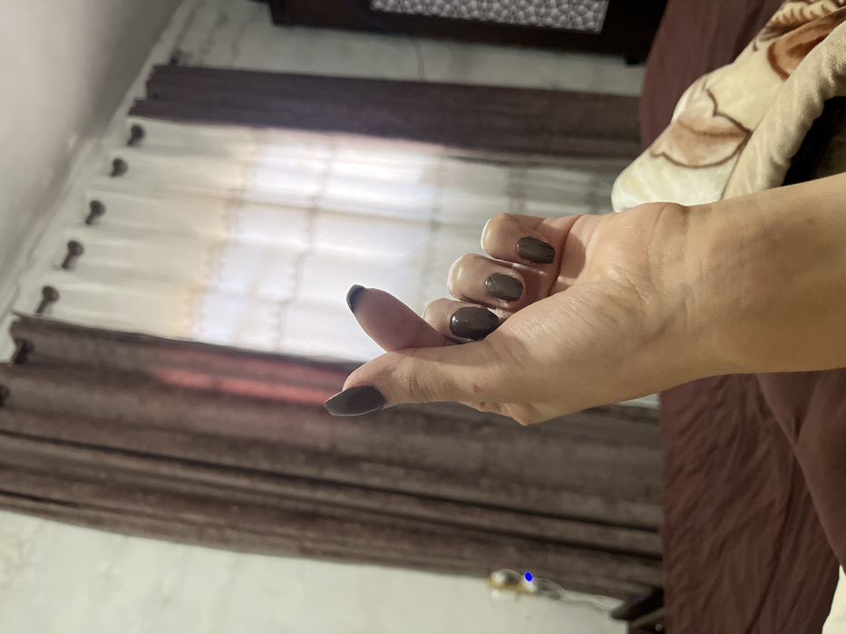 The scene depicts an indoor environment, located in the city of Nuseirat, Palestinian Territory. In the foreground, a human hand, light-skinned with visible knuckles and a minor reddish mark on the back of the thumb's base, is performing a "finger heart" gesture by crossing the index finger and thumb. The fingernails are painted a dark, possibly brownish-grey, color, with some slight chipping visible on the tips of the thumb and index finger. The other fingers are curled inward. In the background, a window is covered by two layers of curtains. The outer layer consists of dark brown, possibly textured, heavy curtains, while the inner layer is composed of lighter, sheer white or cream-colored fabric, allowing diffuse light to enter. The curtains are suspended from a rod with dark brown grommets. To the far left, a light-colored wall contains a white electrical outlet. A cable, possibly a charger, is plugged into the outlet, and a small blue indicator light is visible emanating from a connected device. Below the window and partially visible in the bottom left, a dark brown bedspread or blanket covers a surface. To the right of the hand, a cream-colored blanket with a lighter brown, possibly patterned, design is draped over the dark brown bedding. A dark brown piece of furniture, possibly a wardrobe or cabinet with a textured panel, is partially visible on the far right.