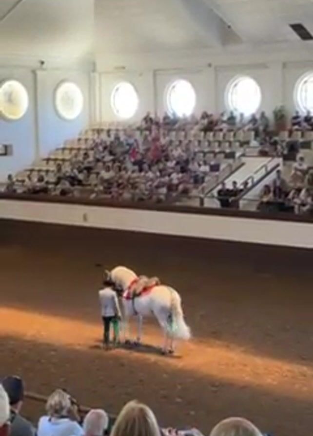- "white horse and its handler standing in the center of an indoor equestrian arena" by FM-E1hwL2, licensed under CC BY 4.0