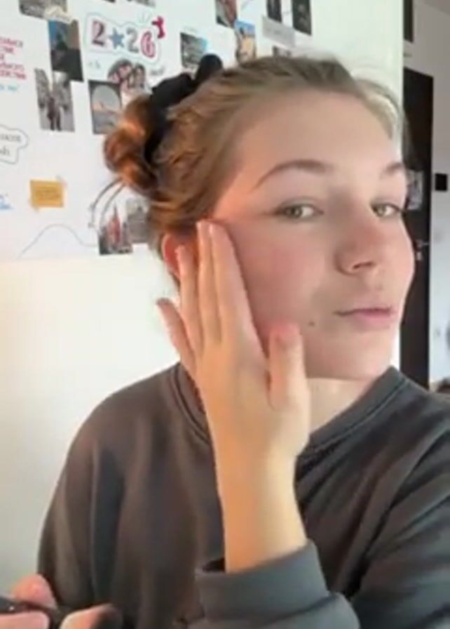 A young woman with fair skin and light brown hair in a bun is applying blush to her cheeks with a large, round makeup brush. She is wearing a gray long-sleeved shirt. Her background includes a white wall covered with photos and notes. She is looking directly at the camera with a slight pout.