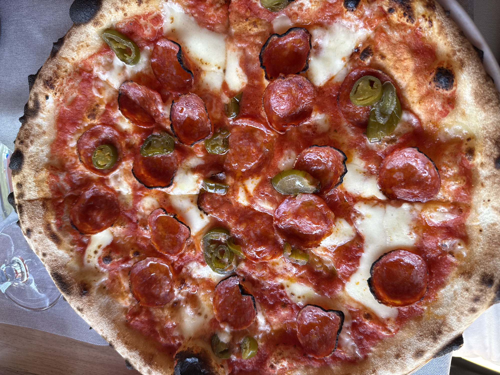 - "A top-down view shows a freshly baked pizza with a slightly charred crust" by FM-GCb712, licensed under CC BY 4.0
