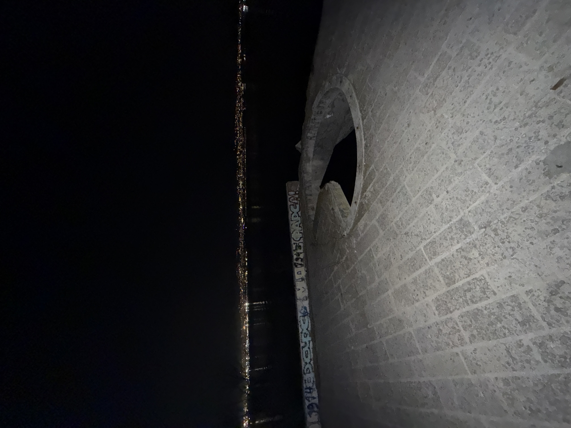 The image depicts a nighttime scene at the Old Lighthouse Pier within the Sea Garden (Morska Gradina) in Varna, Bulgaria. In the foreground, a paved surface constructed from rectangular, light-grey concrete or stone blocks extends from the viewer's perspective. A prominent feature is a large, roughly circular opening in the pavement, approximately centered in the lower mid-frame, with a broken section on its left rim. The interior of this opening is dark, indicating depth. Immediately beyond the paved area, a low, concrete retaining wall, roughly one meter high, is visible. This wall is extensively covered with light-colored graffiti, including Cyrillic characters and the partial number "1994." Beyond the wall and extending to the horizon is a wide body of dark water, likely Varna Bay or the Black Sea. Across the water, the distant coastline is illuminated by a dense array of numerous yellow and white city lights, indicating an urban area. The sky above is completely dark and devoid of visible stars or other celestial objects. No individuals or active movements are present in the scene. The overall lighting is dim, sourced primarily from the distant city lights.