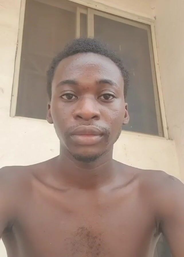 A shirtless young man with short dark hair stands in front of a tan wall with a screened window