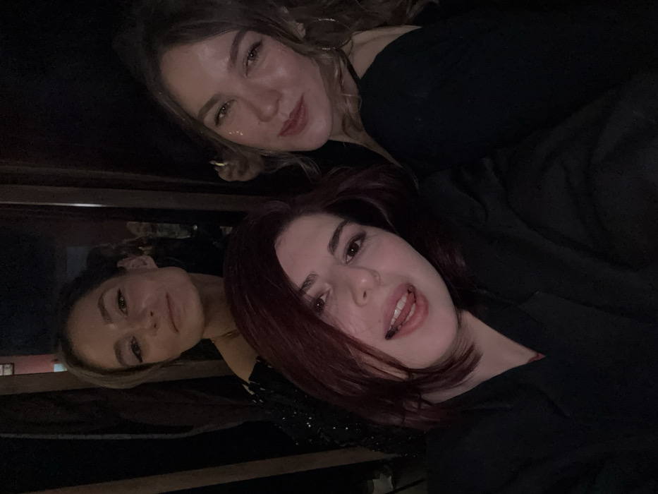 Three young women pose closely for a photo. The woman at the top has blonde hair and subtle glitter makeup. The woman to the lower right has short, auburn-colored hair and an open mouth. The woman on the left wears a dark patterned outfit. All three are wearing dark clothes, and the overall lighting is dim. The perspective is slightly tilted.