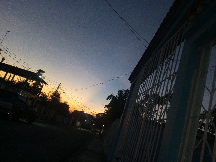 This image depicts a residential or urban street scene in Tinaquillo, Venezuela, during twilight, likely dusk. The foreground on the right features a light blue metal fence or gate with a grid pattern, angled diagonally, partially obscuring the view beyond. The roofline of a building with a dark, possibly corrugated, roof is visible immediately behind the fence. The midground and left side of the image show a dark paved street running diagonally. A dark-colored vehicle, consistent with an SUV or pickup truck, is parked or moving slowly on the left side of the street, partially silhouetted. Further along the street on the left, several buildings are visible, one of which exhibits artificial interior or exterior lighting, casting a yellowish glow. Trees and dense vegetation are present throughout the scene, appearing as dark silhouettes against the sky. Overhead utility poles and multiple electrical or communication lines crisscross the upper portion of the frame. The sky transitions from a deep dark blue at the top, where faint celestial bodies are visible, to a distinct gradient of orange and yellow hues near the horizon, indicative of a recent sunset or impending sunrise. No individuals are discernible in the scene, and no specific actions or interactions are evident. The overall lighting is dim, relying on the ambient twilight and scattered artificial light sources.