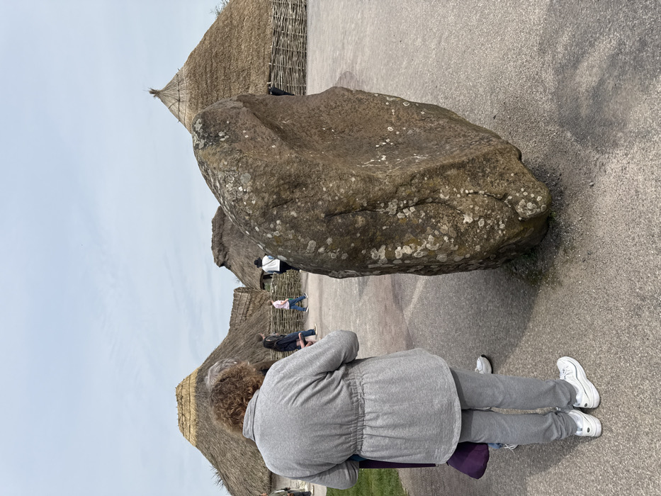 The image captures an outdoor scene at the Neolithic Village reconstruction, located near the Stonehenge Visitor Centre in Amesbury, United Kingdom. In the foreground on the right, a large, irregularly shaped standing stone, dark grey and covered in patches of white and green lichen, stands vertically on a light grey, compacted ground surface. To the left of the stone, a person with curly brown hair, seen from behind, wears a light grey zipped jacket with a cinched waist, matching grey trousers, and white athletic shoes. A purple bag is partially visible by their left leg. In the midground, several reconstructed roundhouses with conical thatched roofs and wattle-and-daub walls are visible under an overcast, light grey sky. A low woven fence separates a pathway from some of these structures. Multiple other individuals are present in the midground, walking or standing. One person in a white top and dark hat stands near a roundhouse, while another in a pink top and blue trousers walks from left to right along a pathway near the fence. The overall environment is an open-air historical site with scattered trees visible in the distance.