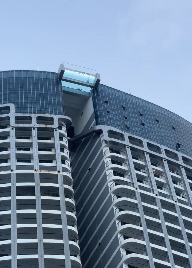 tall building with a swimming pool located on the top. The building is made of concrete and glass and has a modern design. The sky is overcast and gray. The pool seems to be glass-bottomed and held in place between two asymmetrical towers. People can be seen in the pool at the top.