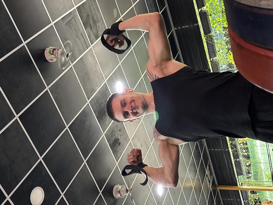 A muscular man in a black tank top is posing with exercise straps in a gym. He is standing on a black and white tiled floor, smiling at the camera. He is flexing his arms to show his muscles. There is an exercise ball and a window visible in the background.