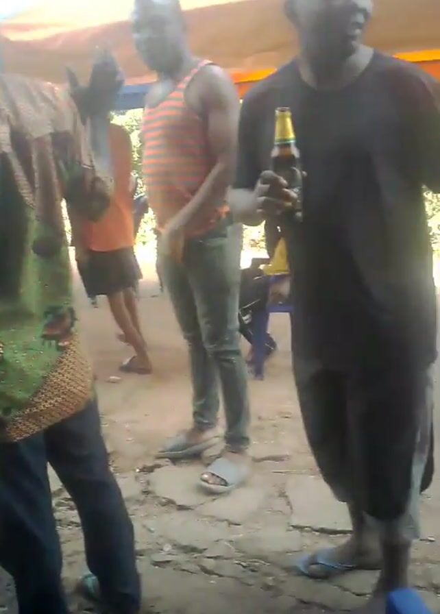 several people in an outdoor setting. In the initial shots, three men are visible. One man wears a green and brown patterned shirt with dark pants and sandals. Another man wears a striped tank top with jeans and sandals. A third man holds a bottle of beer. Later, the video shifts to a group of people sitting around a table. A man stands by the table, appearing to be preparing something in a bowl. The people sitting at the table are wearing traditional clothing, and there are drinks on the table. The environment appears to be a backyard or gathering space, with trees and a tent-like structure visible in the background. People seem relaxed and engaged in conversation.