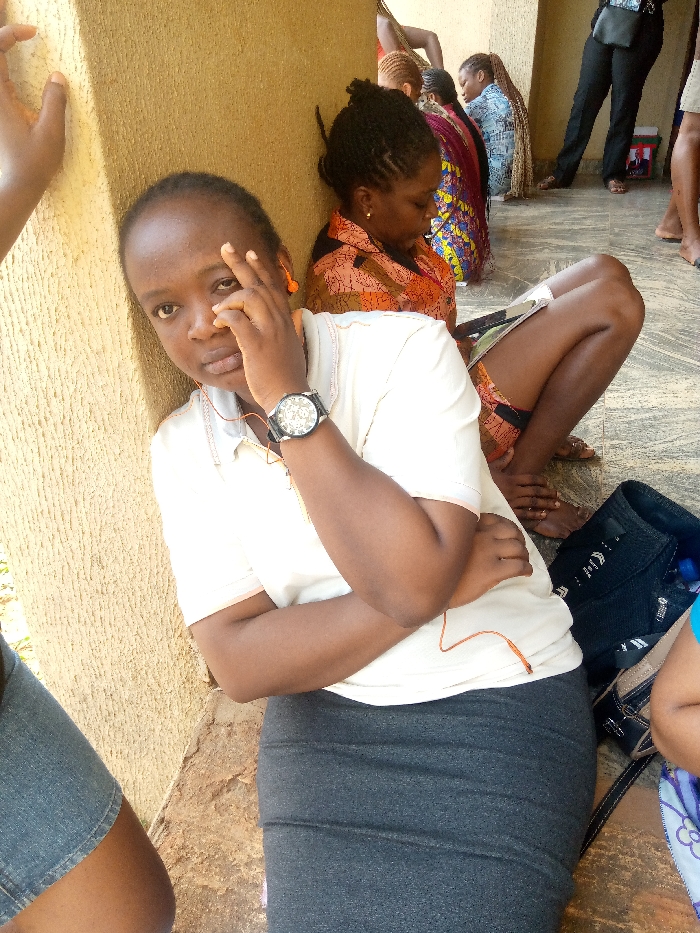 The scene depicts a group of individuals, primarily females, gathered in a covered outdoor or semi-enclosed area in Nsugbe, Nigeria. The floor is tiled with a light, speckled pattern, and a textured, light brown pillar or wall is visible on the left. In the foreground, a young Black female is positioned leaning against the pillar. She has short, dark hair and is wearing a light cream-colored polo shirt with a collar and short sleeves, paired with a dark grey pencil skirt. A large, dark-colored wristwatch with a light face is on her left wrist. Orange wired earbuds are visible, with one in her right ear. Her right hand is touching her face near her right eye, and her left arm is crossed over her right forearm, which rests across her midsection. She is looking directly towards the viewer with a neutral expression. Immediately behind and to the right of the foreground subject, another Black female is seated on the tiled floor, looking down. She has braided hair styled upwards and is wearing an orange and black patterned top and matching shorts. Her bare feet are visible, and she appears to be holding a silver-colored electronic device (possibly a tablet or e-reader) in her lap. Further in the background, additional individuals are visible. One female with long, braided hair is seated on the floor, wearing a vibrant patterned garment (blue, yellow, purple). Other partial figures are present, some standing, suggesting a waiting area or social gathering. A dark bag containing a blue bottle rests on the floor to the right of the foreground subject.