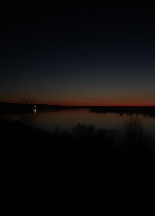 The video displays a dark landscape at twilight. The sky transitions from a dark blue at the top to a reddish-orange at the horizon. A body of water reflects the sky. The foreground is a dark silhouette of trees. A small light, possibly a star or distant light source, is visible in the upper portion of the sky. Dog barks can be heard in the background.
