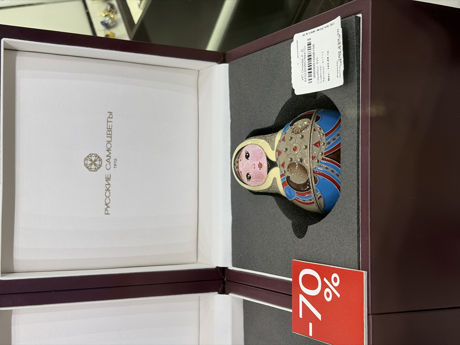 A maroon and white box reveals a matryoshka doll-shaped bracelet nestled in a black foam insert. The doll has a painted face and colorful designs. The box's inner lid features the inscription "РУССКИЕ CAMOЦВЕТЫ" and "1912" beneath a diamond-shaped logo. A price tag with a barcode and details such as "Серебро 925," "Артикул: 41713," and "Вес: 142,68 гр" is attached. A red sign with "-70%" suggests a discount.