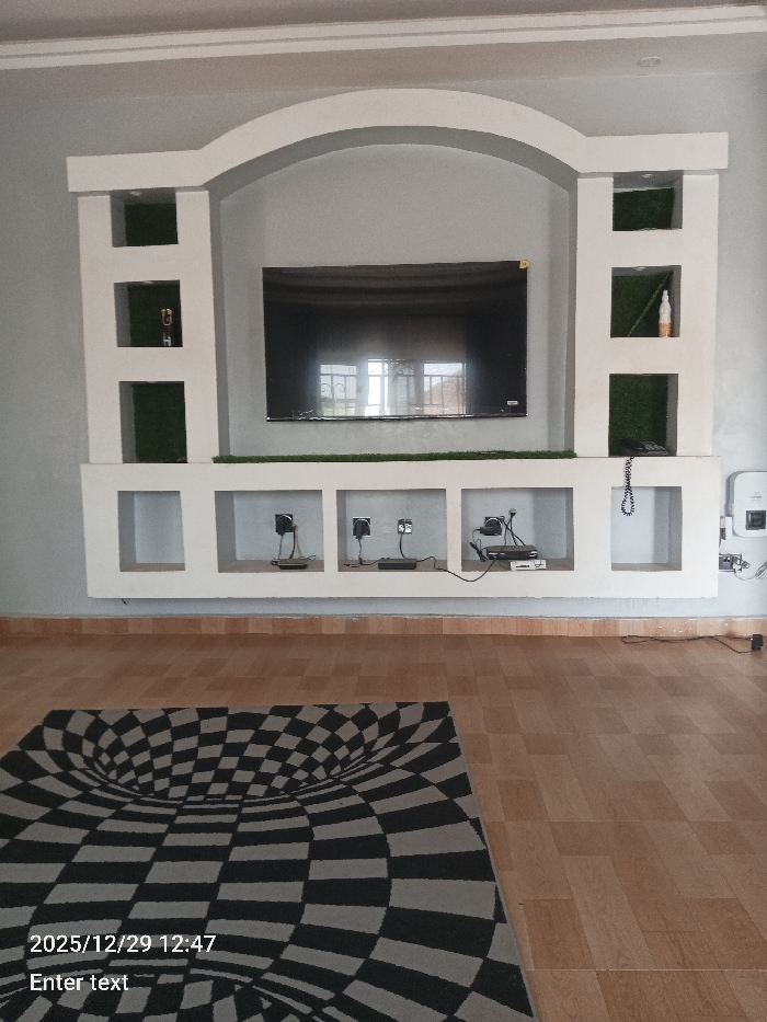 The image displays an indoor living space in Makurdi, Nigeria. The primary subject is a custom-built, white media console spanning a light grey wall. A large, dark-screen flat-panel television is mounted within the console's central arched recess. The television's surface reflects an external window or door frame with security bars, indicating natural light. The media console features two vertical columns flanking the television, each with three open square cubbies. The top-left, middle-left, and top-right cubbies are backed with artificial green turf. A gold-colored trophy or figurine is positioned in the top-left cubby, and a white cylindrical bottle is in the top-right cubby. Beneath the television, a horizontal section of the console contains five open compartments. These compartments house various electronic devices, including what appears to be a cable box or media player, connected to power outlets via visible black wiring. A coiled black cable hangs from the right side of the unit. To the far right of the console, a white utility box, likely an inverter or stabilizer, is mounted on the wall with electrical connections. The floor is covered with light brown, wood-patterned laminate or tiles, bordered by a matching light brown baseboard. A large black and grey checkered rug with an optical illusion design, creating the appearance of a downward-spiraling vortex, is centrally placed on the floor in the foreground. No individuals are present in the scene. A digital timestamp "2025/12/29 12:47" is visible in the bottom-left corner of the image.