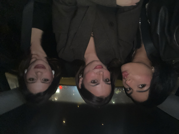 Three females are depicted inside a vehicle at night in Nanterre, France. The interior is dimly lit, with the vehicle's headliner visible above. Blurred lights, including red traffic signals, are discernible through the rear windows. From left to right: 1. A woman with dark hair and medium skin tone is positioned to the left. She is wearing a dark garment, possibly a leather jacket, with a visible zipper. She wears small, light-colored hoop earrings. Her lips are pursed in a "kissing" gesture, and she looks directly at the camera. 2. A woman with brown hair and fair skin tone is in the center. She is wearing a dark-colored blazer with a notched lapel and a single button closure. She wears small, light-colored earrings. Her mouth is closed, and she offers a slight smile, looking at the camera. Her hands are clasped or crossed at the bottom of the frame. 3. A woman with brown, wavy hair and fair skin tone is on the right. She is wearing a dark blazer over a dark top. She wears prominent white, oval-shaped earrings. Her mouth is closed, and she offers a slight smile, looking at the camera. The three individuals are positioned closely, suggesting a shared space, and are posing for a photograph.