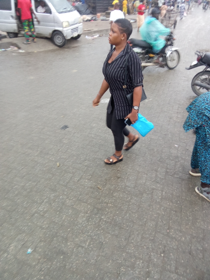 The image depicts an active street scene in Satellite Town, Nigeria, under damp, overcast daylight conditions. The primary subject is a young Black woman positioned mid-frame, walking towards the right. She has short, dark hair and wears a black and white vertical striped short-sleeved shirt over a black undergarment, black leggings, and dark sandals with a metallic embellishment. A black shoulder bag is worn across her body, and a silver-colored watch is visible on her left wrist. She holds a light blue rectangular object in her right hand. Her head is turned slightly to her right, and her gaze is directed forward. In the left background, a silver compact van is partially visible, with a person in a red shirt and patterned trousers standing nearby and another person in a white shirt seated inside. The asphalt road surface near the van contains scattered debris. To the right, the lower torso and legs of a person wearing a blue patterned garment and dark shoes are partially visible. Further back, a person riding a motorcycle, clad in a light blue rain poncho, moves from left to right. The rear wheel and fender of another motorcycle are visible on the far right. Multiple indistinct figures and structures are present in the blurred background. The road surface is gray, damp, and exhibits minor wear and scattered small debris.