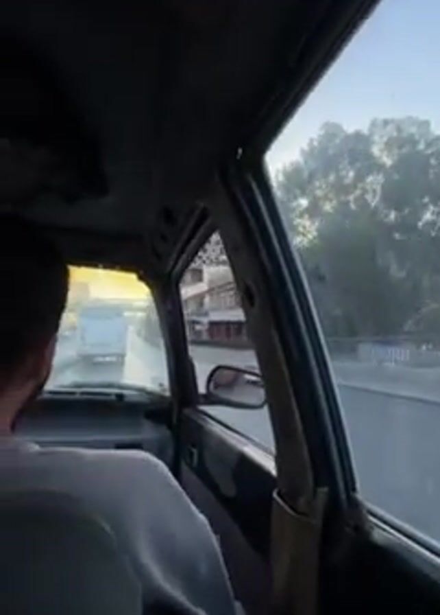 interior of a car with two male occupants. The car's interior is in a state of disrepair, with the roof lining partially detached and exposing the underlying material. The driver is wearing a white shirt and blue jeans, and is holding the steering wheel with his left hand. He appears to be driving, and the car is moving along a road. The passenger is wearing a gray shirt and has short dark hair. The view through the windshield shows a street with buildings on either side. The sun is shining brightly, creating a glare. The road appears to be wet, and there are other vehicles visible in the distance. The driver is speaking.