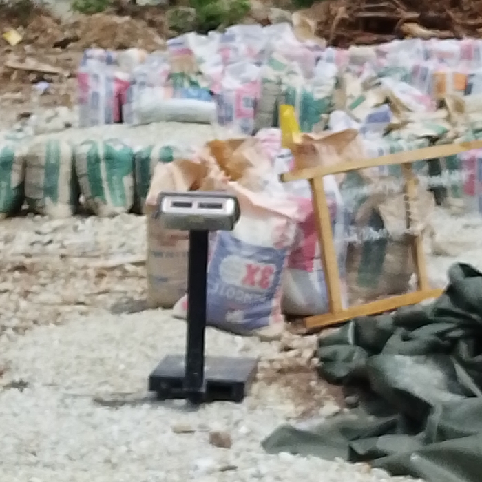 A black, industrial-style scale stands prominently in the foreground. Behind it, several stacked bags of materials are partially visible, one marked with "3X" in red. Additional bags are stacked in the blurred background, creating a sense of abundance. Gravel covers the ground, suggesting a construction site or storage area. A wooden frame leans against some bags.