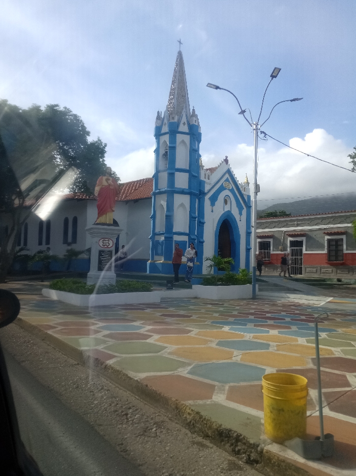 This image depicts the Plaza Bolívar in Santa Ana, Táchira, Venezuela, with the Parish Church Santa Ana (Iglesia Parroquial Santa Ana) as its focal point. The church is a white building with prominent blue architectural accents, including a tall, pointed spire topped with a cross, a bell tower section, and arched entryways. Its main roof is covered with terracotta tiles. To the left of the church's central entrance, a light-colored statue of Jesus Christ, wearing a red robe and yellow undergarment, stands on a multi-tiered pedestal, pointing to his Sacred Heart. The plaza area in front of the church is paved with a distinctive multicolored hexagonal pattern in pastel shades. A modern street light pole with multiple fixtures stands to the right of the church spire. Several individuals are present: two people are standing near the church's main entrance (one in a reddish-brown shirt, another in white and blue attire), and another person in a white shirt is visible near the base of the statue. Multiple indistinct figures are also visible walking or standing further to the right, in front of adjacent buildings. In the immediate foreground, on a concrete curb bordering the plaza, a yellow bucket and a grey-handled tool are visible. The background features other urban buildings with varied facades and terracotta roofs, with mountains discernible under a partly cloudy sky in the distance. The photograph appears to be taken from inside a vehicle, indicated by reflections on the left side of the frame.