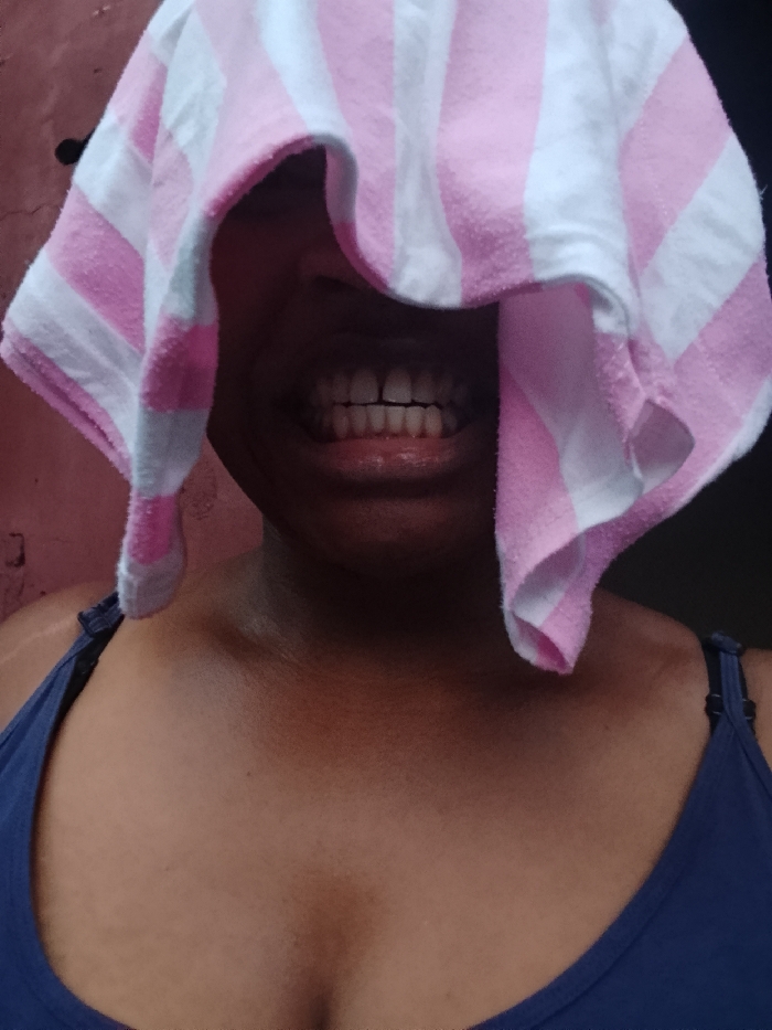 An individual with dark skin, an adult, is depicted from the upper chest upwards, in the city of Agani, Nigeria. A pink and white striped towel covers the upper part of their face, obscuring the eyes and nose, while resting on their head. The subject is smiling, revealing both upper and lower teeth. They are wearing a dark blue garment, with a strap visible over the right shoulder. The background consists of a light reddish-brown wall to the left of the subject and a darker, less defined area to the right.