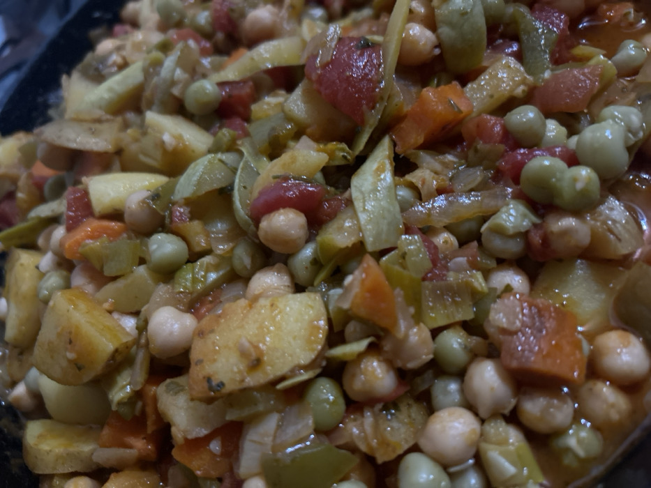 - "A close-up shot presents a medley of vegetables, including diced potatoes, carrots, tomatoes, leeks, peas, and chickpeas, all mixed in a flavorful sauce" by FM-luk4m2, licensed under CC BY 4.0
