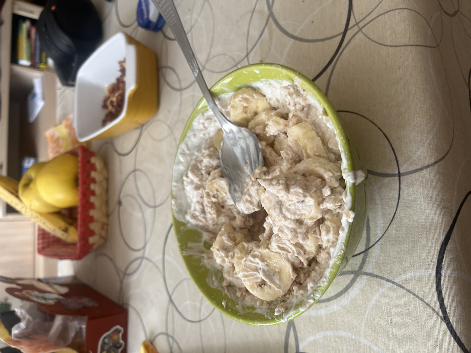 The scene depicts a close-up indoor shot of a prepared meal on a table in Sofia, Bulgaria. In the foreground, a light green ceramic bowl holds a textured beige mixture containing numerous sliced banana pieces and what appears to be oats or cereal blended with a creamy substance like yogurt or cottage cheese. A silver-colored spoon is partially submerged in the mixture, resting against the inner rim of the bowl. A small amount of the creamy mixture has dripped onto the exterior of the bowl. The table is covered by a light-colored tablecloth patterned with intersecting dark, swirling lines. In the midground, to the left, a small red and white woven basket contains a yellow banana and two yellow apples. Adjacent to it, a red decorative box with cartoon elements is partially visible. To the right, a rectangular yellow ceramic dish with a white interior contains dark, reddish-brown granular material, possibly bacon bits or granola. Further right, a partial blue and white container and a black electronic device are visible. The background is blurred, showing indistinct furniture and items, suggesting a domestic setting such as a kitchen or dining area. No individuals are visible.