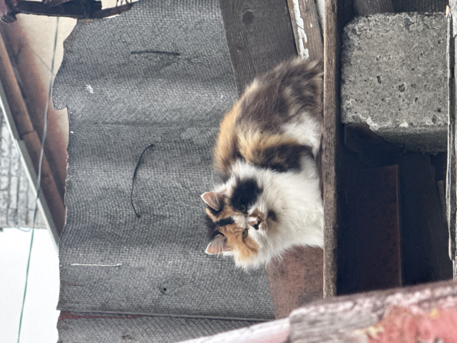 - "A long-haired calico cat with white, black, and orange-brown fur sits on a weathered wooden plank" by FM-46BEJ2, licensed under CC BY 4.0